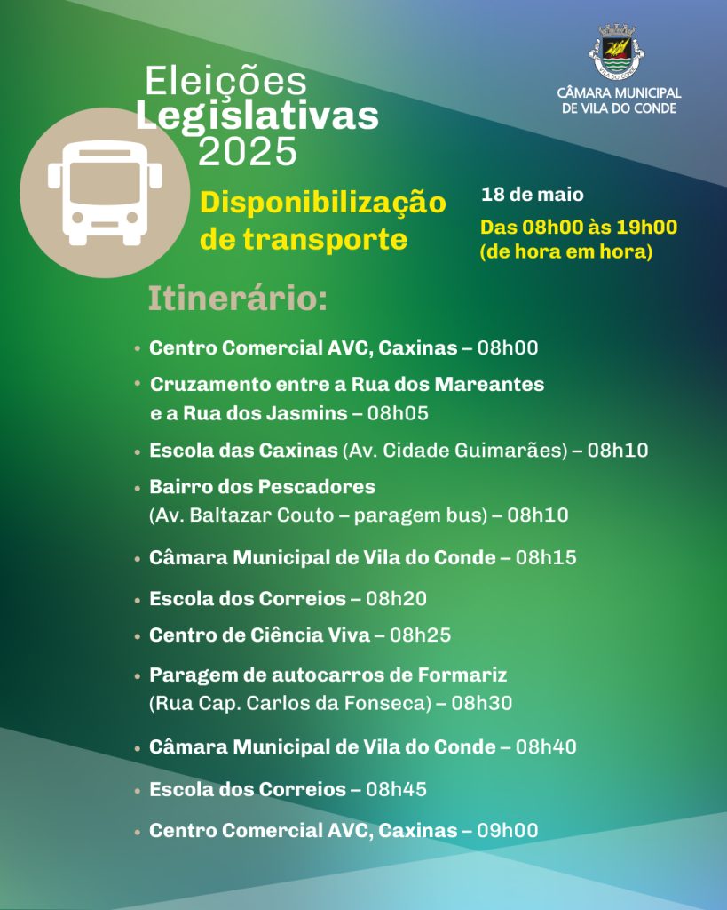 A Câmara Municipal de Vila do Conde anunciou esta 6.ª feira que próximo no domingo fornecerá “transporte gratuito para os cidadãos da cidade poderem exercer o direito ao voto nas eleições legislativas de 2025”.