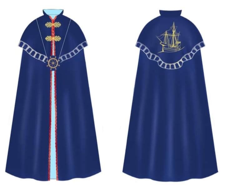O azul é o do mar, obviamente. E depois temos o aqueduto, que está maravilhosamente bem bordado à volta tal como, nas costas, a nau quinhentista O escapulário tem uma corda vermelha e dourada – duas cores de Vila do Conde – e, preso com nós de marinheiro, aparece o símbolo com a forma de uma roda do leme cujas hastes são bilros. Temos a frase do José Régio, “Entre pinhais, rio e mar…” e o nome da confraria. O chapéu tem uma aba, a lembrar os dos Descobrimentos, e um símbolo em madeira, em alusão às rodas do leme.