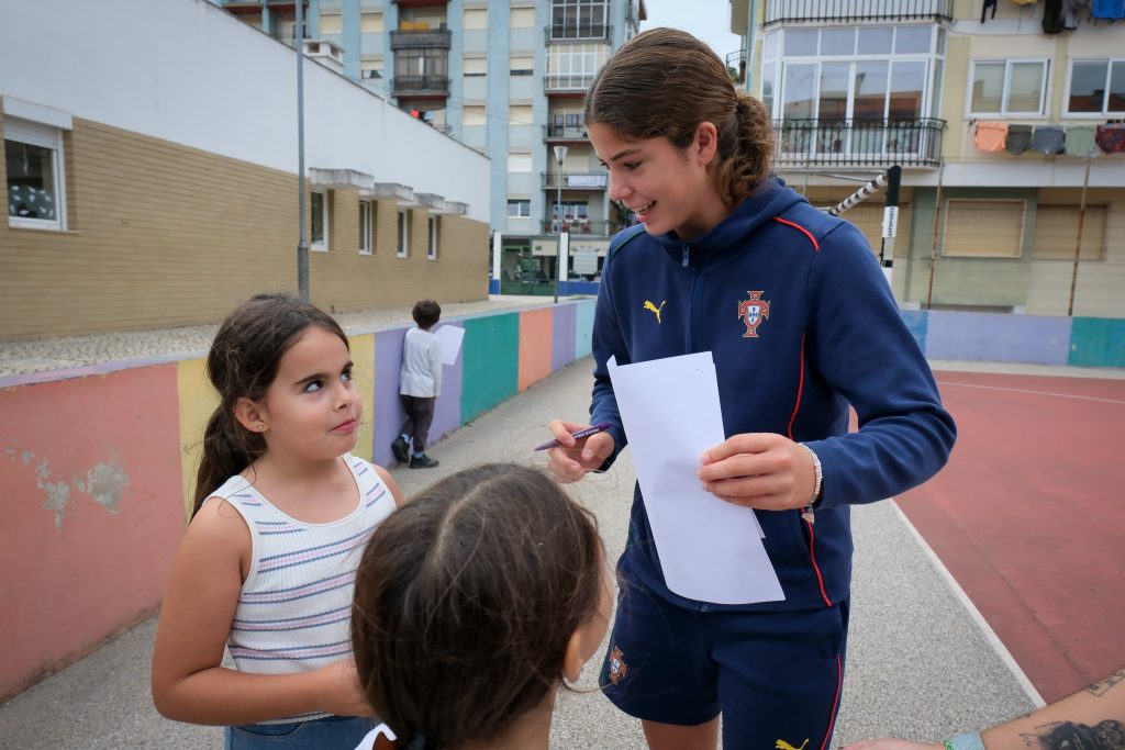 O jogo de hoje significou o final de um estágio que contou ainda com uma visita da comitiva a uma escola (Montalvão) de promoção à atividade no 1.ª ciclo e na qual a futebolista vilacondense foi uma das mais solicitadas (ver foto em baixo).